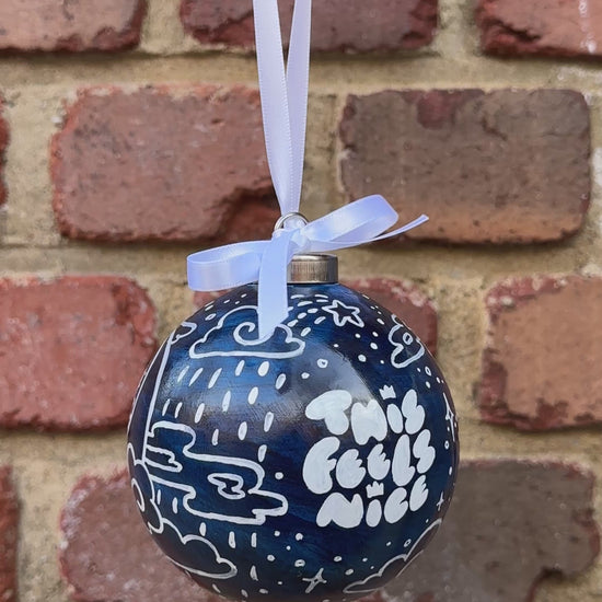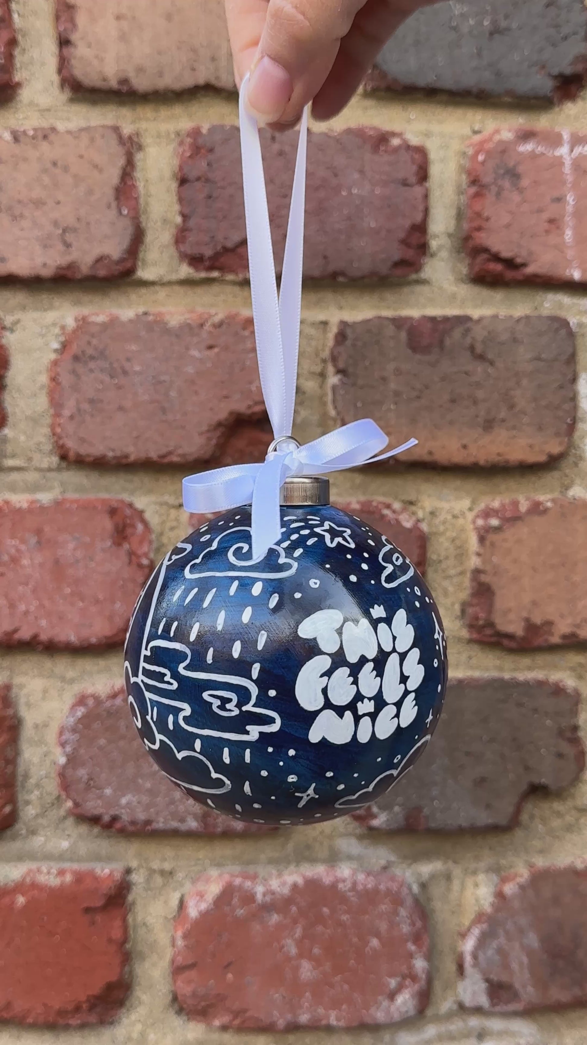 Celebrate the season with the exclusive limited-edition hand-painted ceramic bisque ornament from This Feels Nice. Each piece is carefully crafted and painted by Bridgette Zou, featuring This Feels Nice's signature blue and white design.